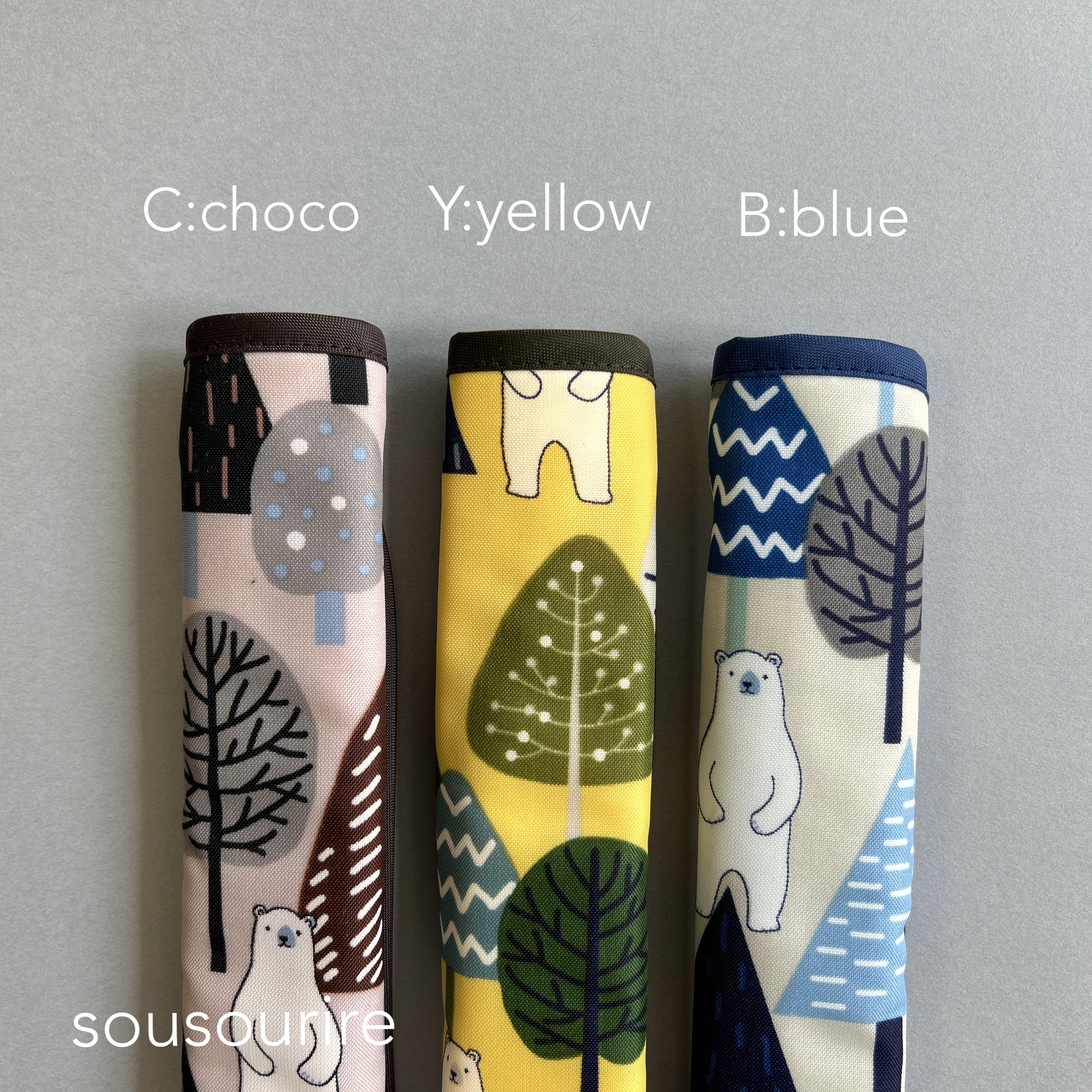 チョコ・カーキ・ネイビーの縁どりにくすみ系ピンク・イエロー・アクアのフリースをあわせました。