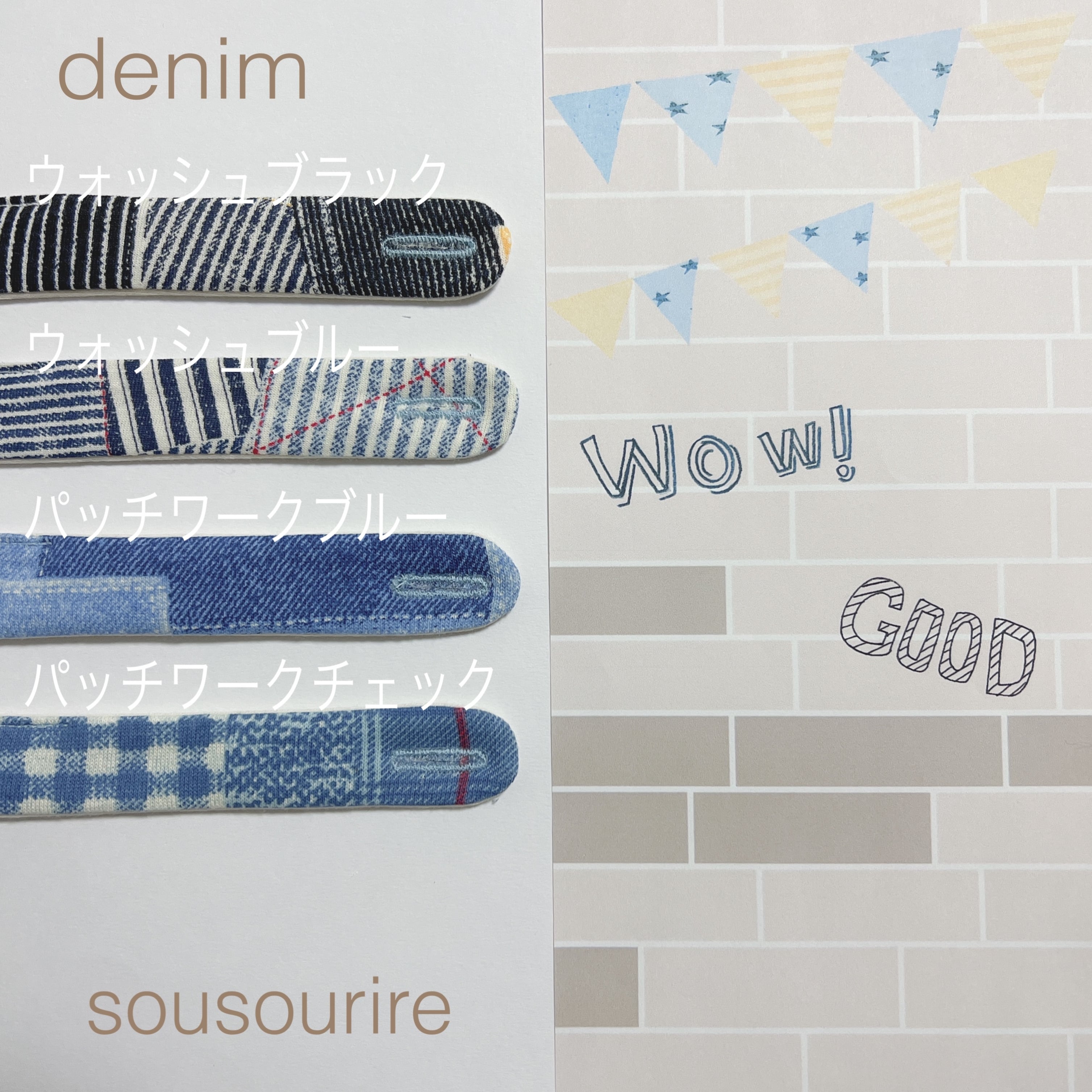 デニム柄のやわらかい天竺生地とスムース生地を使ったひも用のバンドです。